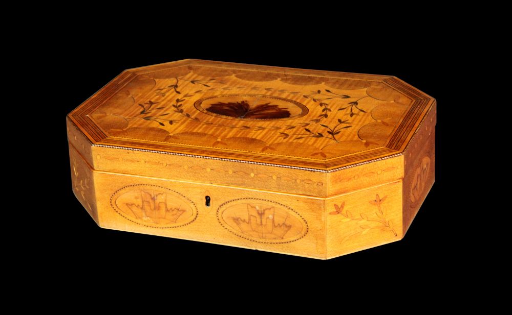 Fine George III period satinwood octagonal box with inlays in exotic woods