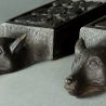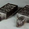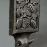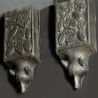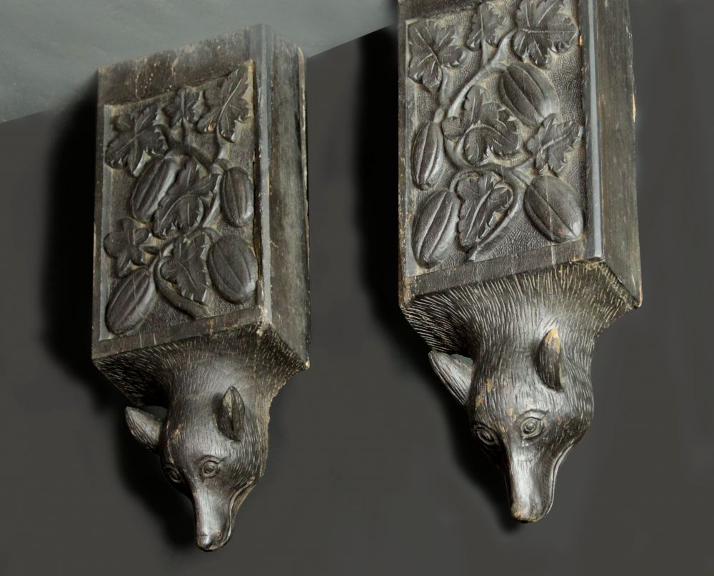 A pair of early 19th Century oak corbels in their original bitumen paint. Finely carved fox heads with flowers and vine leaves in relief