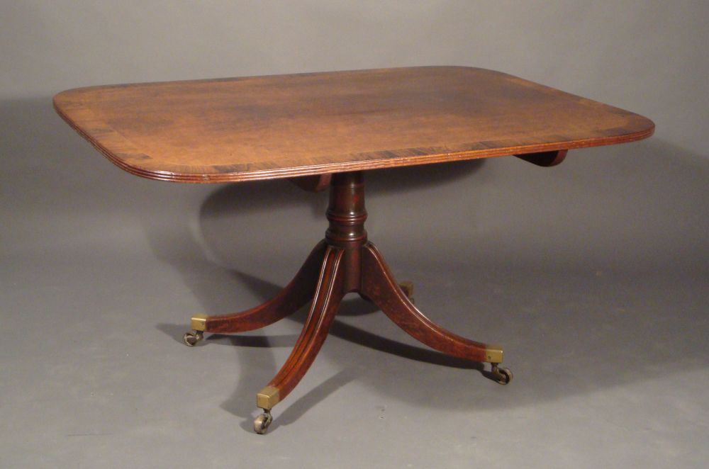 A fine Sheraton mahogany breakfast table; the top of an unusual ‘pommelle’ grain; crossbanded in calamander and with boxwood and ebony stringing; the brass catch stamped ‘Bullock’ and the casters ‘Cocker’; good original colour and condition