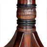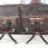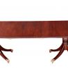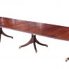 A good George III four pedestal mahogany dining table; all four pedestals, blocks, bearers and their tops are original; the three loose leaves replaced in well matched Georgian timber.  The attractive four splay bases with finely carved stems, ebonised turnings and ebony stringing in the sabre legs.
