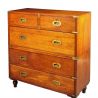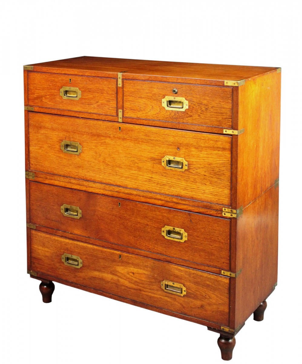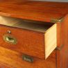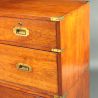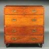 An English made teak military chest with its original brass corners and all but one of its original handles.  Still with original unscrewable feet.  Top right drawer has a stronger lock.  This form of miltary chest was made over a long period from the early 19th to the early 20th century ~ the design of the skeleton escutcheon with a straight bottom edge is for circa 1890.  This chest is in remarkably good condition with clean drawer linings ~ most of these chests have picked up more damage on their travels.