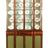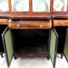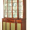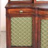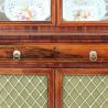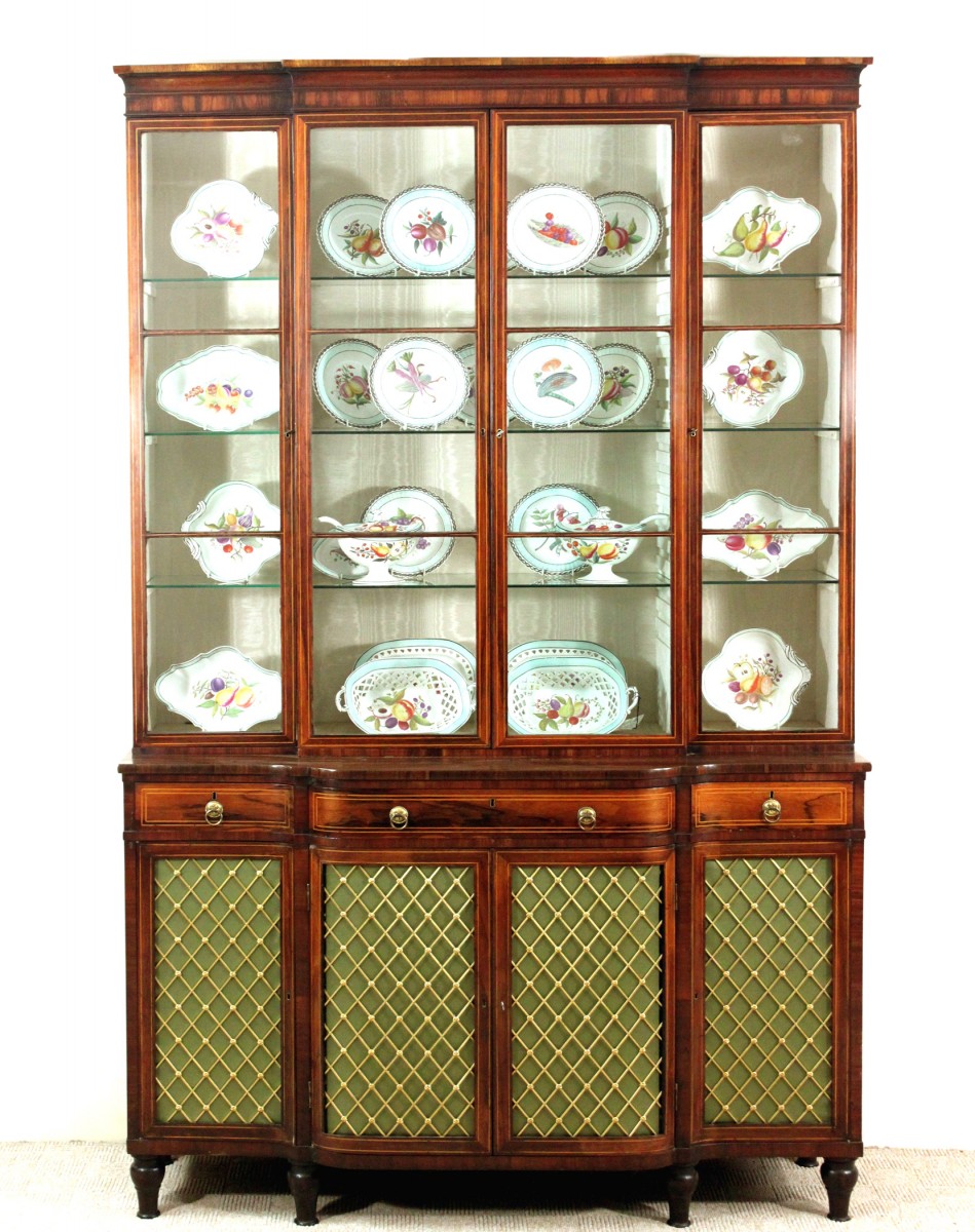 A fine Regency breakfront bookcase in the manner of Gillows of Lancaster: rosewood with a double line of box wood stringing and the original grained rosewood peg feet; now fitted as a display cabinet but we could easily replace the glass shelves with wooden ones and remove the silk. We will be replacing the silk in the lower doors with grills and pleated silk.