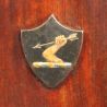 The armorial is of an unclothed arm holding aloft an arrow and has a blue and yellow twisted base, it is the crest of the Irish branch of the Baker family.