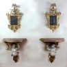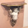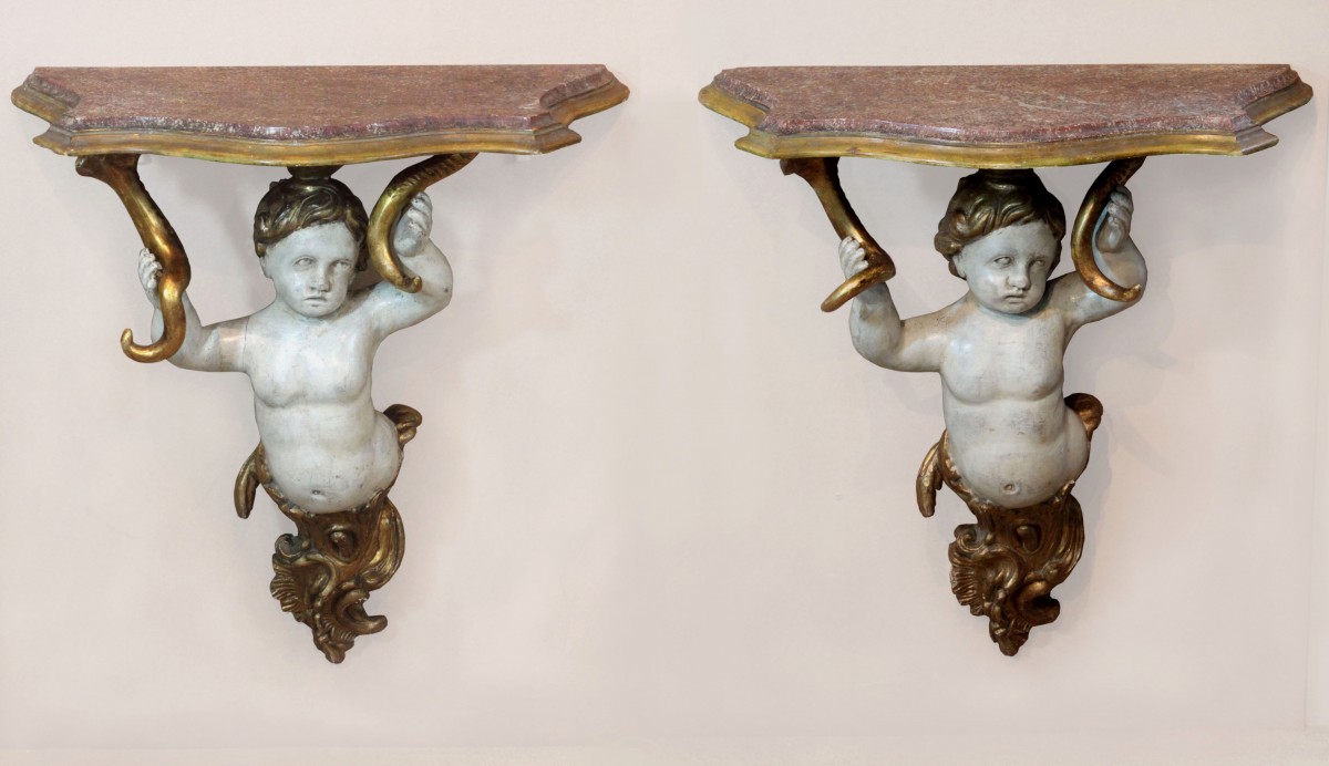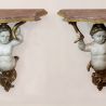 A pair of late 19th Century console tables: finely carved wood putti with their original gilding supporting faux porphyry wooden tops.