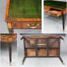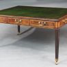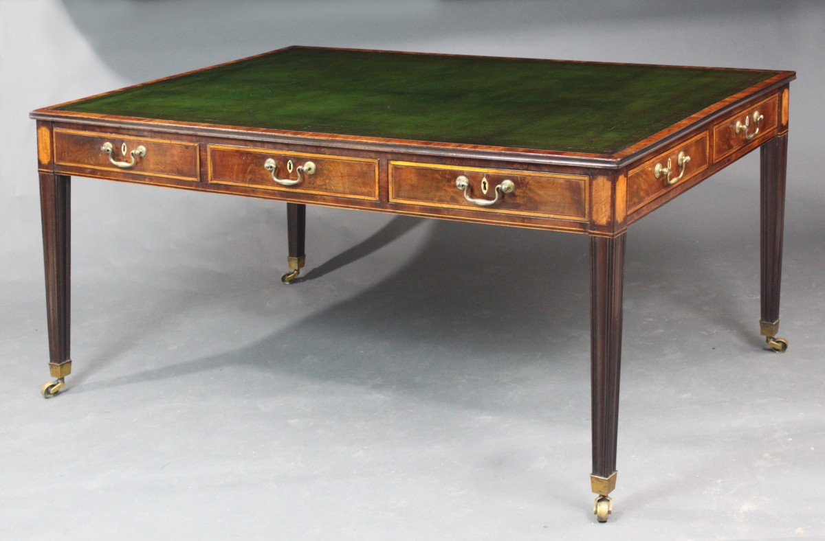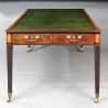 A rare George III Sheraton period partners writing table in figured mahogany of a good colour and patina. Attractive model with satinwood inlay, false drawers on the sides and square tapered moulded legs. Most of the swan-neck handles are original.