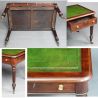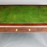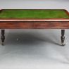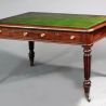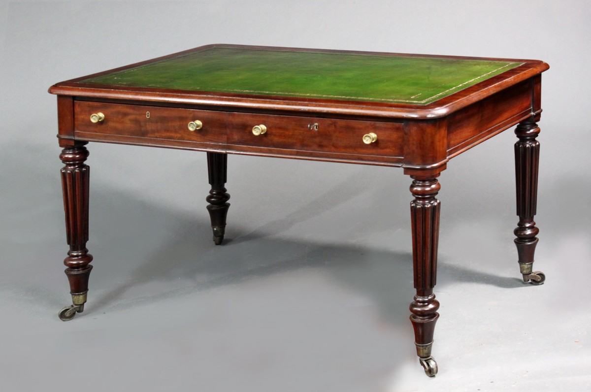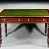 A small William IV mahogany writing table on turned and reeded legs, two mahogany lined drawers with false drawers on the back and a recently fitted good quality green hide