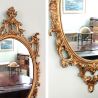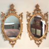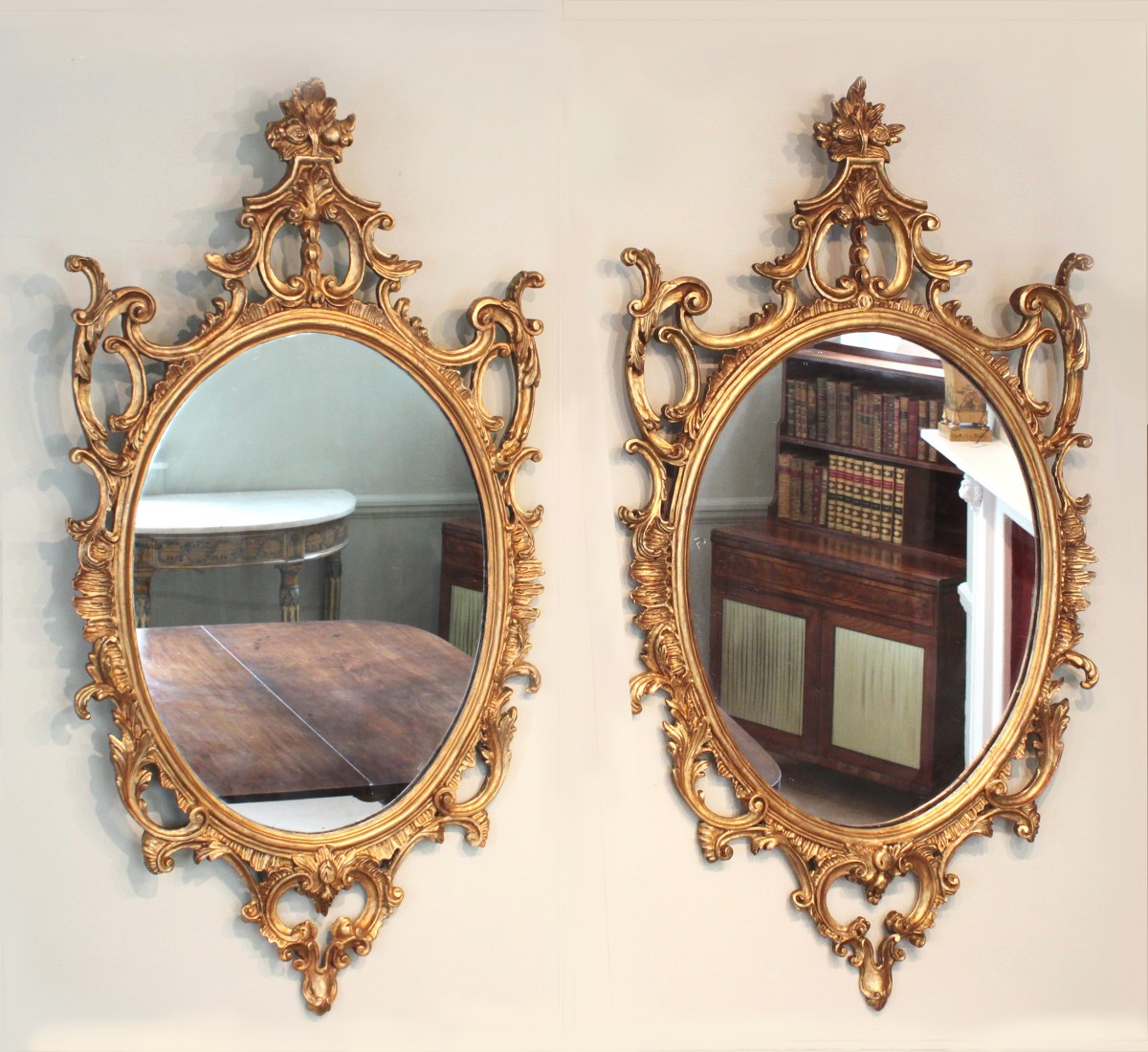 An attractive near pair of 19th century Chippendale style gilt wood oval mirrors; superb carved detail with rococo scrolls and acanthus leaves; one mirror has finer carving and we suspect it was made in the 1840s with the second made to go with it in the 1880s. Judging by the age of the backs, they are clearly antique and 19th century. Some of the gilding original but refreshed, both the same colour & in the afternoon under indirect sunlight the colour becomes richer.