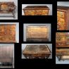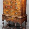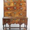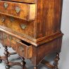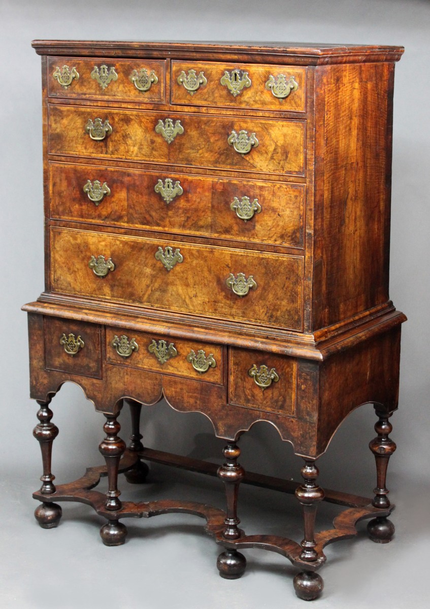 An early 18th Century veneered walnut chest on stand of a superb colour and patina. The drawers with matched veneers, herring bone banding and cross-grained mouldings and carcase fronts throughout. Original wavy stretcher stand and bun feet. The fret handles are old mid-eighteenth century replacements.
