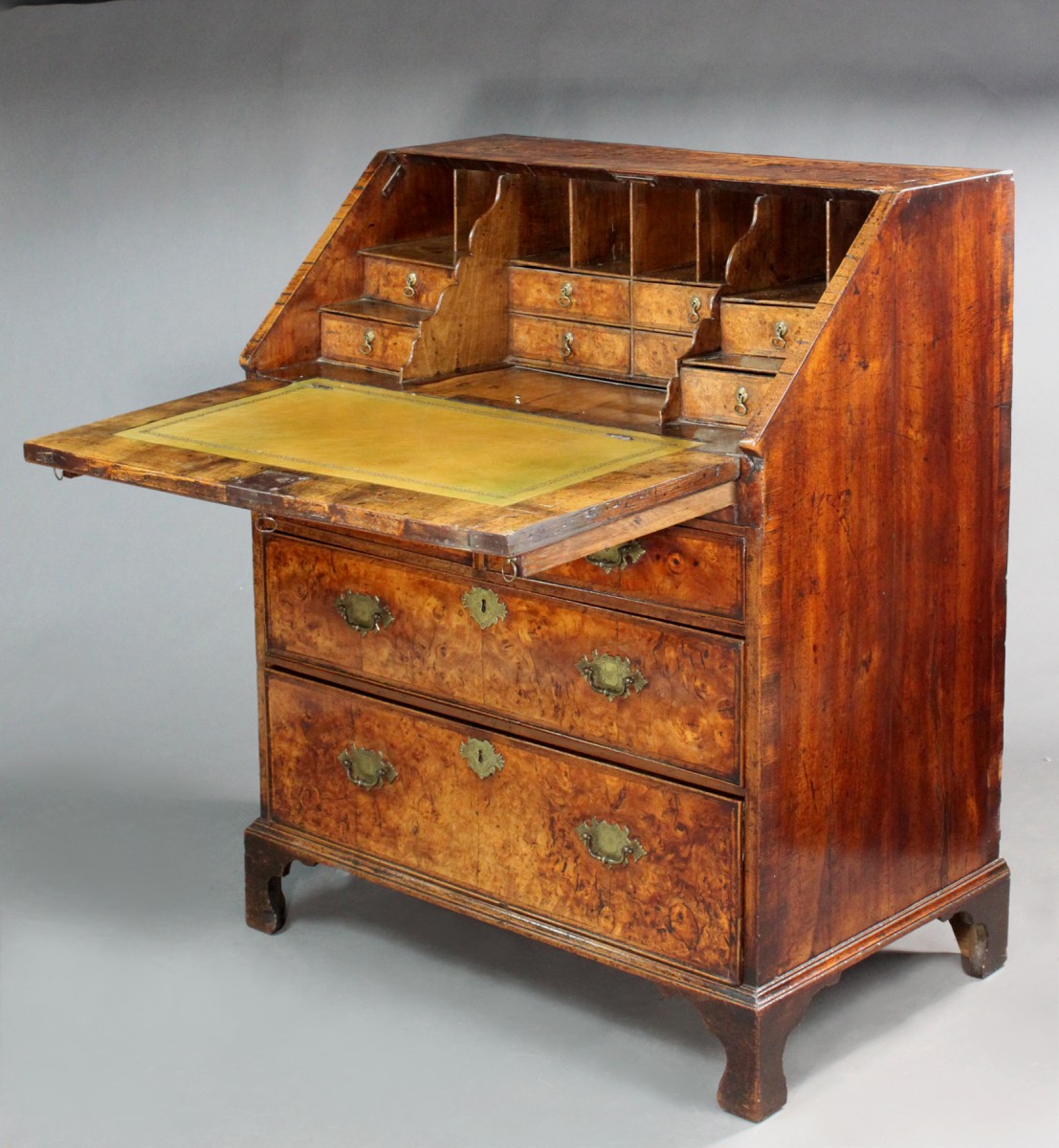An early 18th Century burr ash veneered bureau with a well and stepped interior. The drawers, fall and top have cross-grained and herring bone banding and matched veneers.