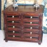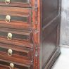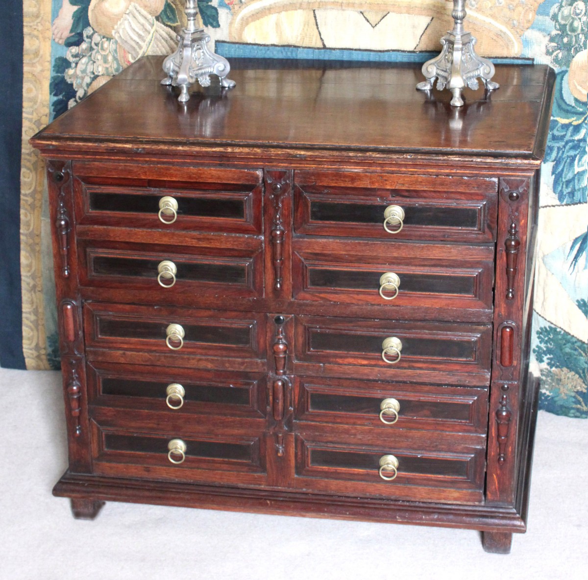 A Charles II seventeenth century oak chest with moulded drawers, snakewood and bog oak panels and turned spindles and applied designs down each side. The top four drawers are half width and the bottom three drawers are full width.
