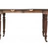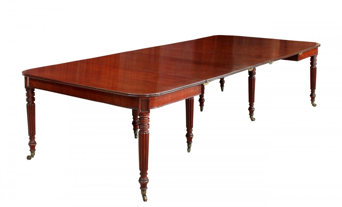 A fine Regency mahogany dining table attributed to Gillows of Lancaster: good model with shallow frieze, rectangular tablets at the top of the legs, elegant slim turned and reeded legs with brass castors and oak extending action with compartment to store clips and bolts; the superb figured top has one replaced leaf in well matched Georgian mahogany. Closes down to two side tables each with their own extending action and these bolt together when the table is in dining table mode.