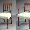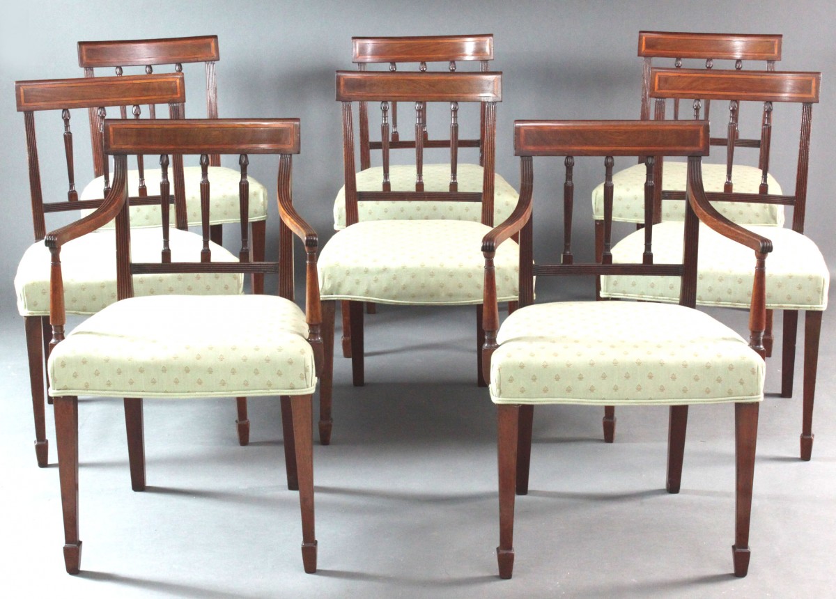 A good set of 8 George III Sheraton period dining chairs in mahogany of a good colour and patina; attractive backs with T-bars inlaid with satinwood and box wood and ebony stringing, fine reeded detail including to the top of the arms and to the attractive inset spindles which also have leaf carved tops. On square tapered legs with spade feet.  Very comfortable.