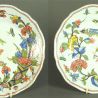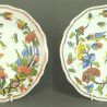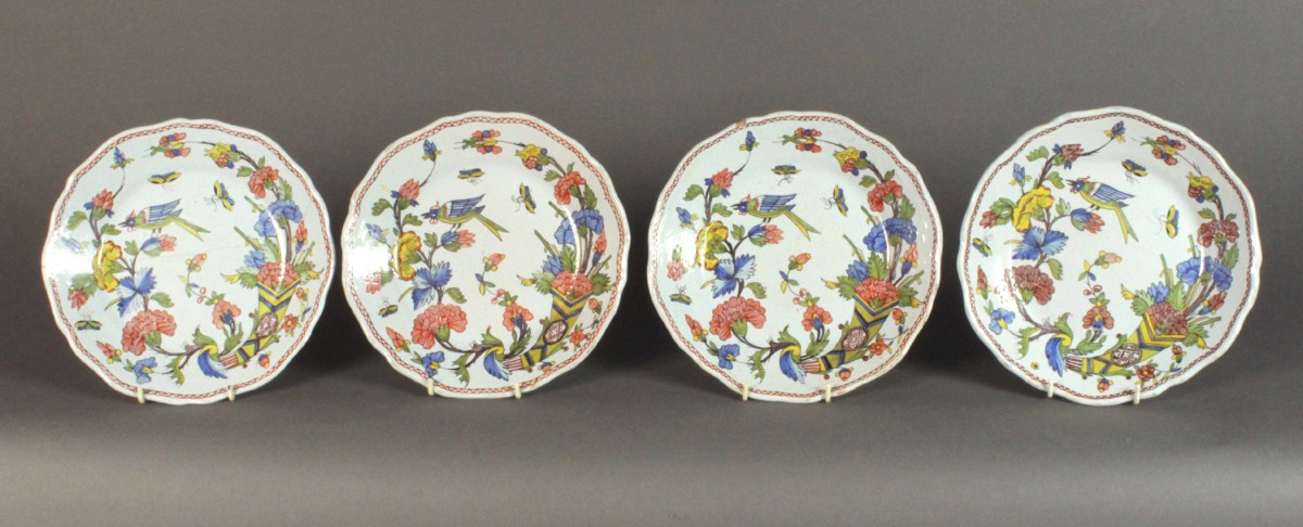 An attractive set of four 18th century French faience plates in good bright enamel colours decorated with flowers, cornucopia, birds and butterflies.