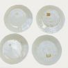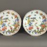 The workman has marked his work with two blue dots. Old collector's labels on the backs. Two of the dishes in good condition, another with a small rim chip and the 4th broken in 2 and glued back together, some glaze crazing.