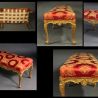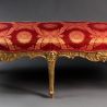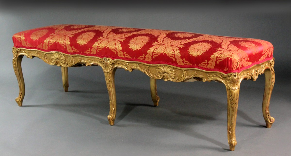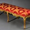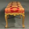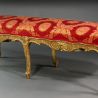 A fine Louis XVI style giltwood cabriole leg stool with carved detail: shells, acanthus leaves and foliage. Most of the original gilding intact with the attractive red bole showing through in places; some sympathetic restoration where the gilt was worn.