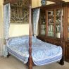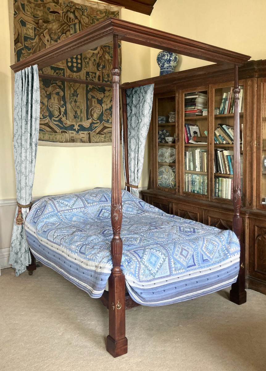 A George III four poster bed with mahogany end posts particularly finely carved with acanthus leaves, drapery, rope twists, a complete daisy and extensive stop-fluted and reeded detail. The 19th cornice in the Chippendale manner with dentils and egg and dart carving.