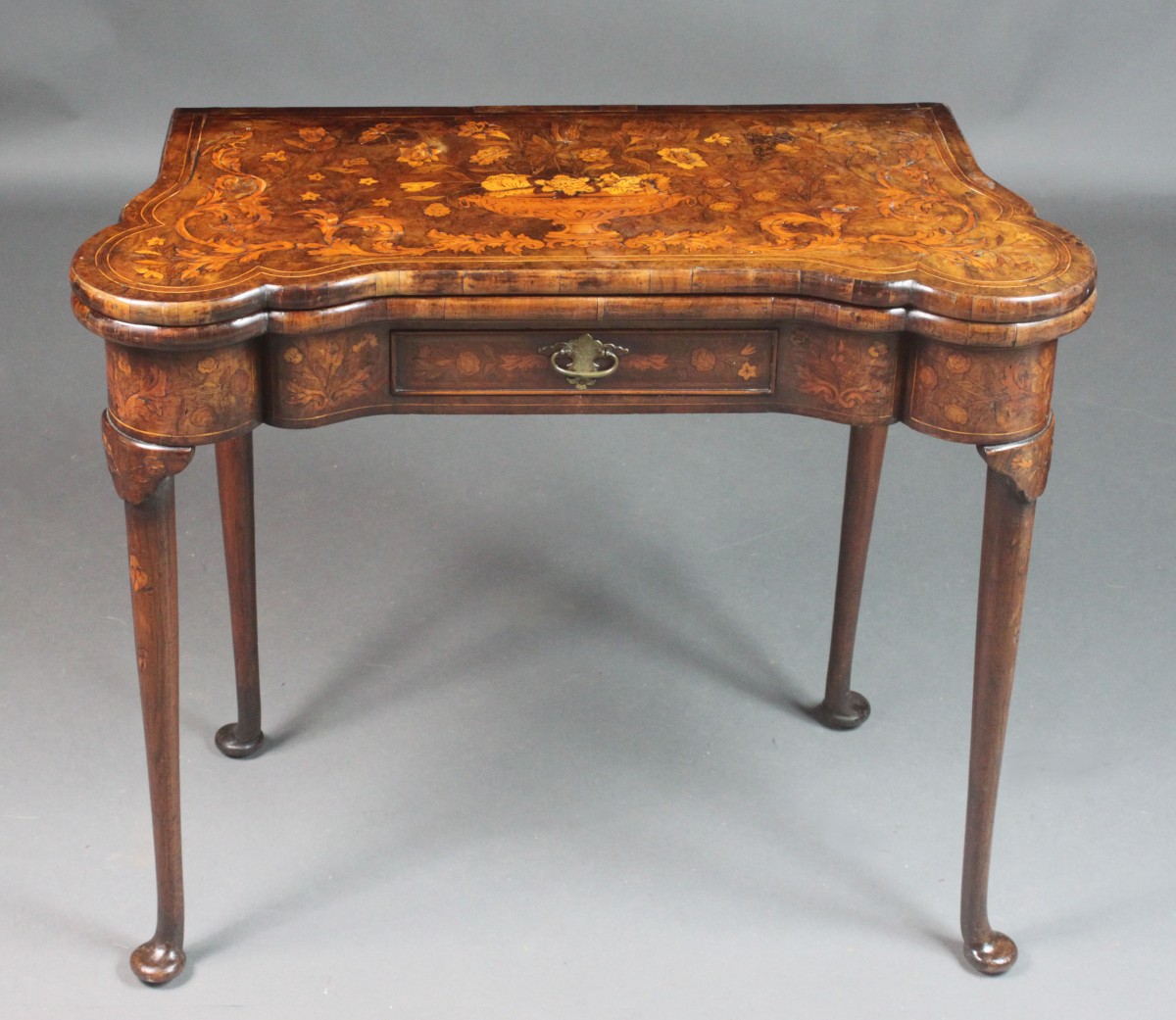 A good Dutch walnut pad foot card table with attractive marquetry inlay of birds and flowers; both back legs hinge on a knuckle joint to support the table when open, the interior with counter wells and inlaid with the four card suits.  Oak-lined drawer and good original colour and patina.  The card table would appear to be mid 18th century, but it is thought that marquetry was often added in the 19th century.