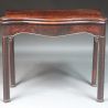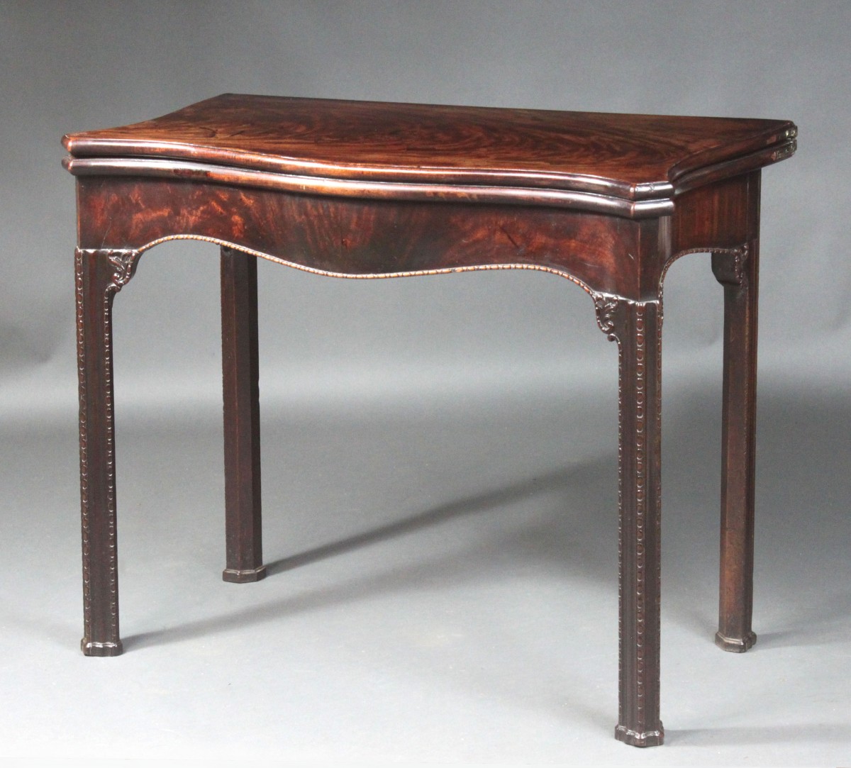 A fine George III Chippendale period serpentine-front figured mahogany card table of a good colour and patina; attractive model with shaped sides and frieze, the moulded legs and frieze with extensive egg and dart carving and corner brackets with carved acanthus and a carved scroll, the legs terminating with carved plinth feet. The top with some veneer cracks on the right side.
