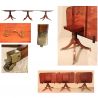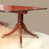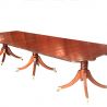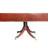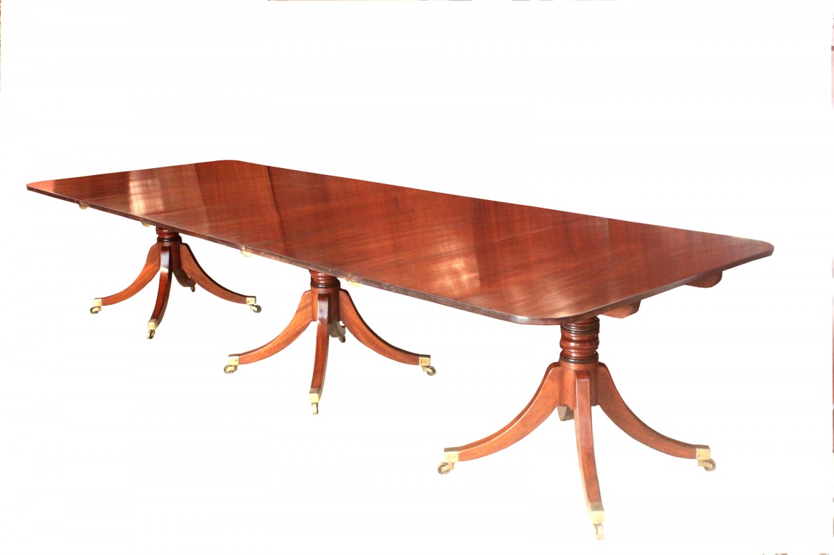A good Regency triple pillar dining table in figured mahogany, only 48” wide, handsome four splay pedestals with their original tops, the stems with 2 ebonised turnings matching the black ebony stringing in the sabre legs. The castors stamped with a crown & E S & P patent. Original catches in old lacquer. The blocks veneered in mahogany - unusually the bearers are screwed onto the blocks rather than dowelled which means the table can be easily disassembled and packed into a smaller crate. The 2 loose leaves replaced in well matched period timber.