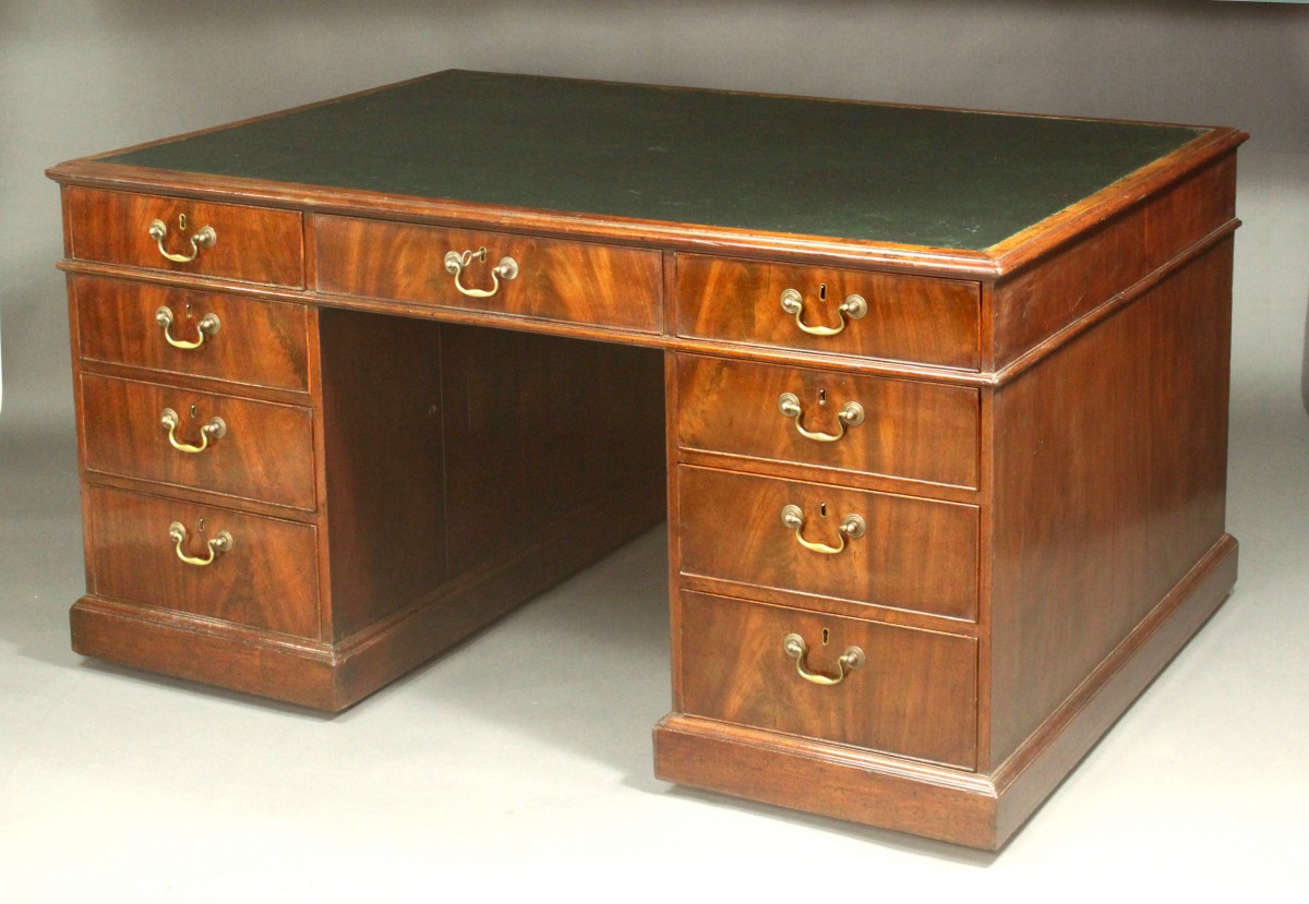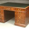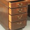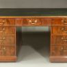 A rare George III partners desk of a good nut-brown colour and patina, drawers on the front and back (no cupboards), the cock-beaded drawer fronts attractively veneered in one continous sheet of figured mahogany, cedar lined drawers and many of the original 2 pin locks still present. Good original large castors - the desk can rolled easily across a room. A rare feature is the secret spring-loaded drawer in the kneehole. The desk is in 1 large section and doesn't dismantle. The swan neck handles are through the orginal holes and the later knobs holes were plugged and veneered over so they hardly show.