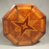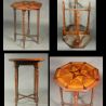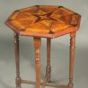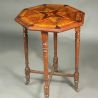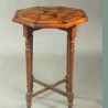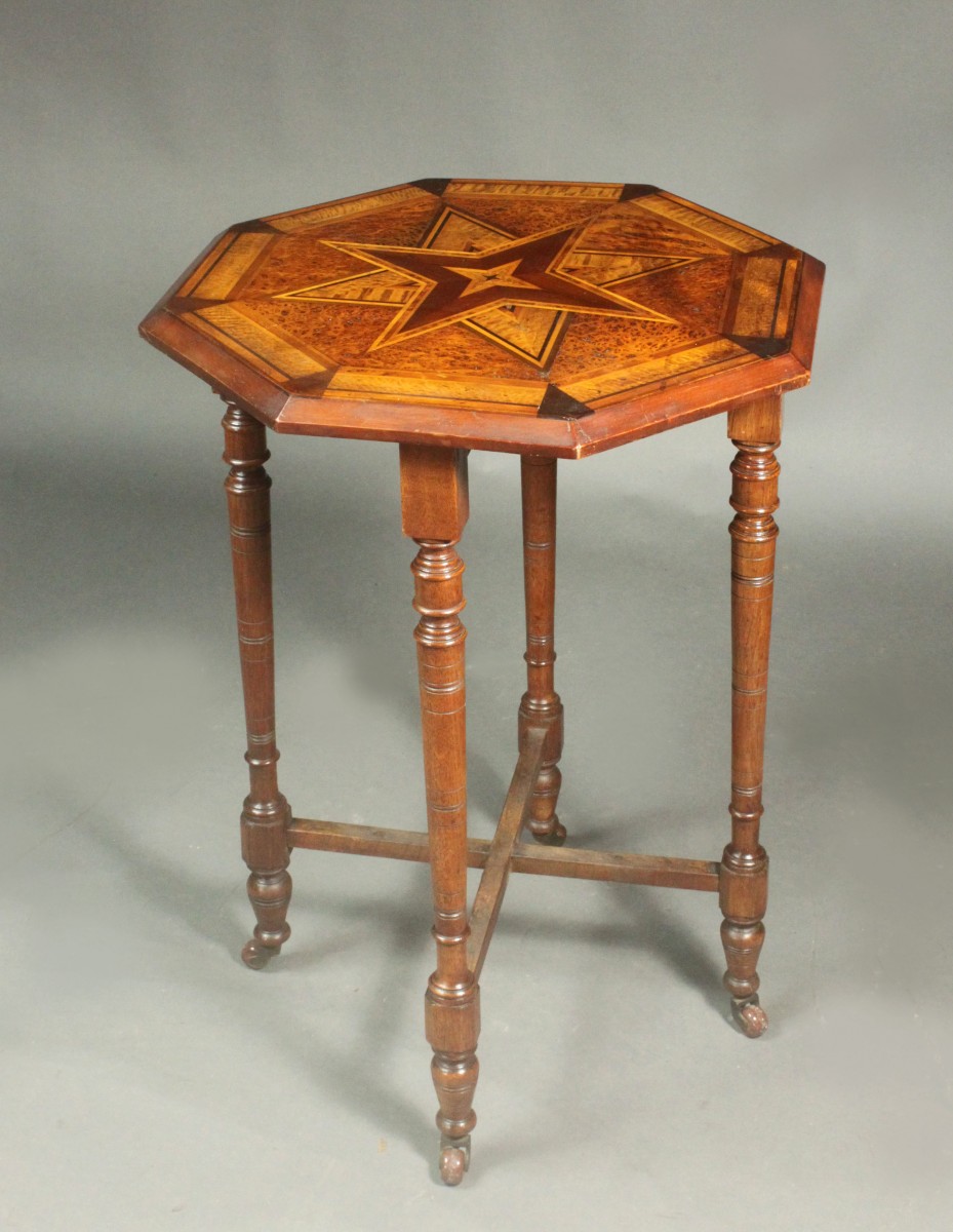 Late 19th century New Zealand native timber inlaid table in the manner of Anton Seuffert, the octagonal top with various show woods in the form of stars: the indigenous woods probably include kauri, mangeao, towai and rimu on a rewarewa ground; on turned oak legs and castors.