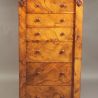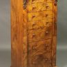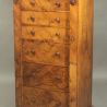 A good Victorian figured walnut Wellington chest with well carved corbels and flower heads and a secretaire drawer fitted with 2 drawers veneered in burr maple.