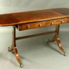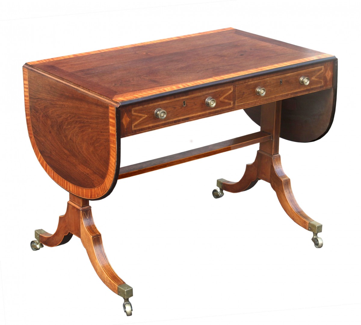 A fine Regency sofa table probably by William Trotter of Edinburgh; elegant model with long slim proportions, in rosewood with satinwood cross-banding and attractive box wood inlay to the drawer fronts and sabre legs. The table has 3 of its 4 original puma head knobs and its original castors.