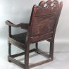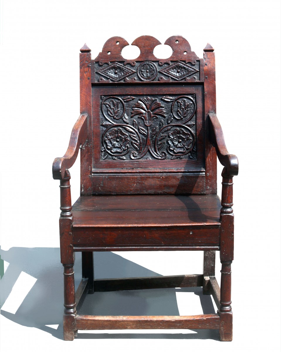 A late 17th wainscot chair in oak of a good colour and patina and handsome carved back; channel mouldings to the back and seat rails and boldly turned gun barrel legs and arm supports;  please see photo of the underside of the seat  - the seat is clearly old with marks of it having had a centre bearer but is possibly a Victorian replacement.