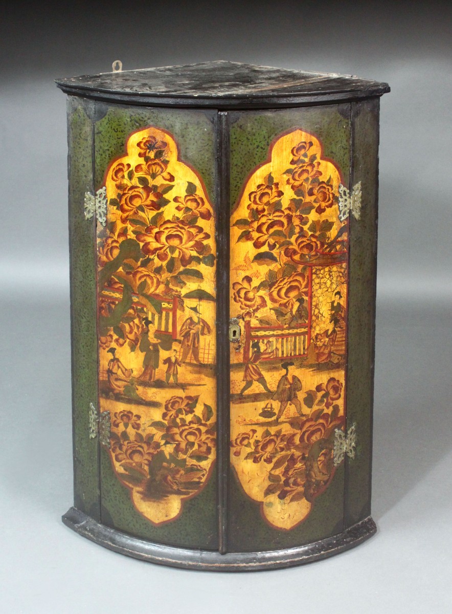 An oak hanging corner cupboard with attractive chinoiserie decoration. Very similar construction details to an 18th painted cupboard I have at home but I think this one was possibly re-decorated in the mid-ninteenth century - the decoration you might see on a 19th century tea tin.