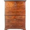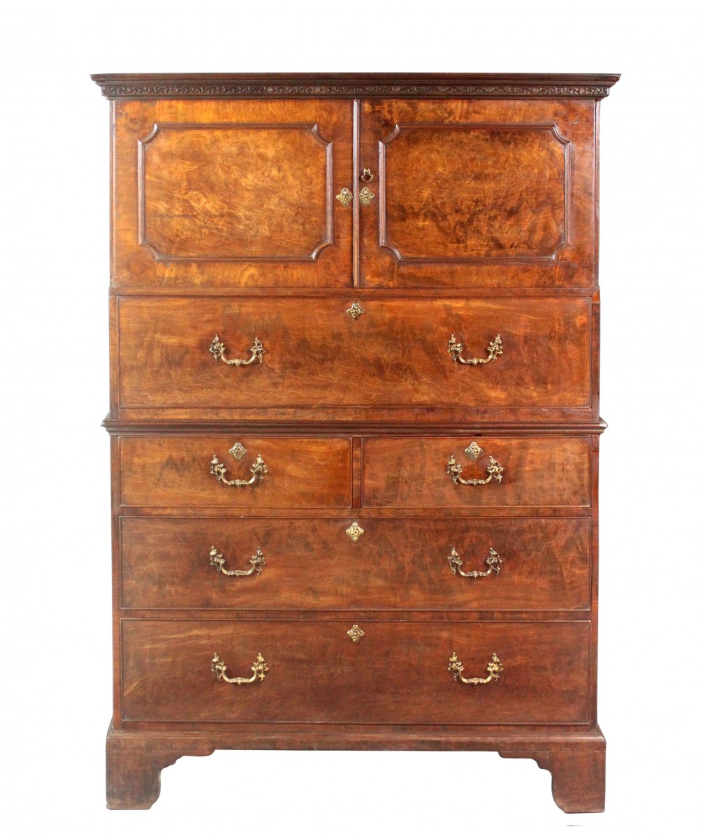 A fine tall chest or cabinet in the manner of Thomas Chippendale with an unusual and attractive layout of cupboards and drawers which suggests that it could perhaps have been a special order for a Georgian estate. It is made of a rare type of mahogany with areas of dark wavy grain which may be fustic mahogany from the Caribbean or Africa.