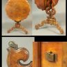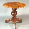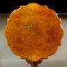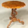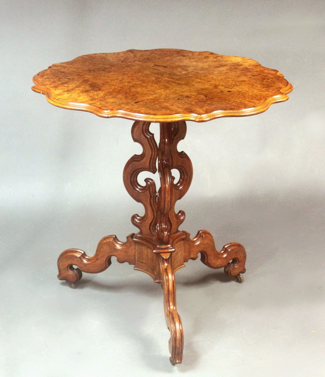 A fine quality occasional table, the revolving quarter-veneered burr walnut top with shaped serpentine edge and counter-veneered in figured walnut; the handsome walnut base with 3 sectioned stem and tripod legs carved with rococo scrolls.  See also the fine brass catch and brass castors with wooden wheels.