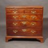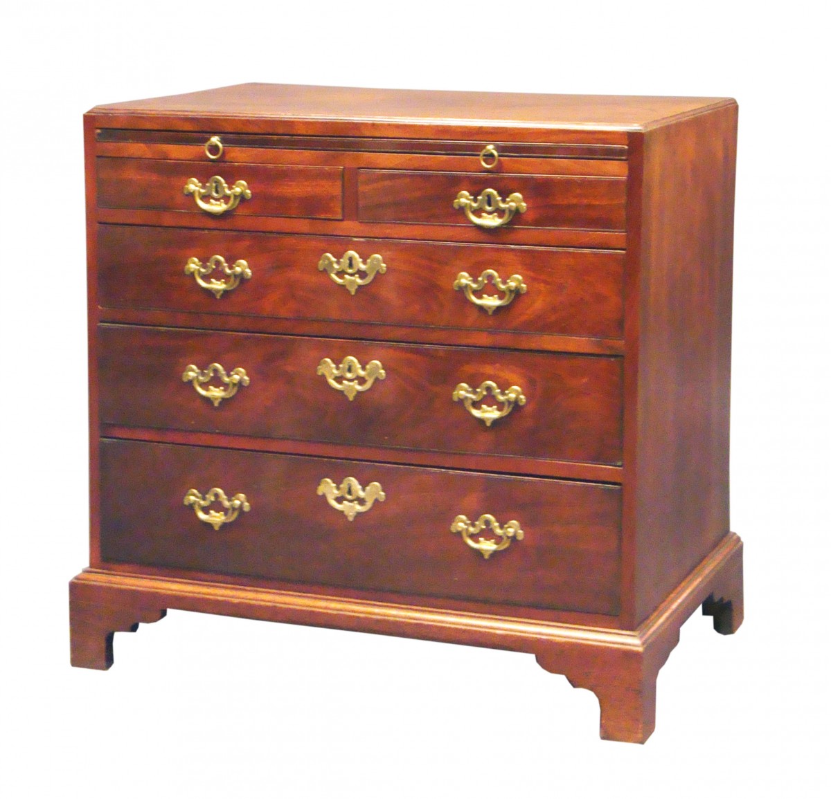 A George II period caddy-top mahogany chest of four drawers with a brushing slide: original open plate brasses and oak lined drawers in the manner of Giles Grendey. Several chests bearing Grendey labels have similar caddy top chests and open plate handles. Please see Charles Mackinnon & Alexander George Antiques.