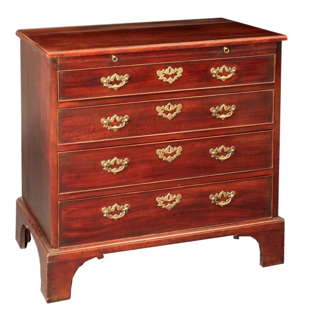 George III small mahogany chest of drawers with original plate handles, bracket feet and with a brushing slide; the drawers oak lined, good colour and patina