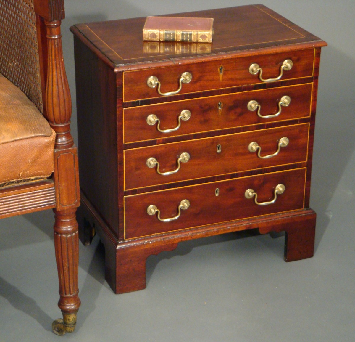 Miniature Georgian mahogany chest of drawers with rosewood cross banding and boxwood stringing. These miniature pieces were usually either salesman's samples or apprentice pieces.