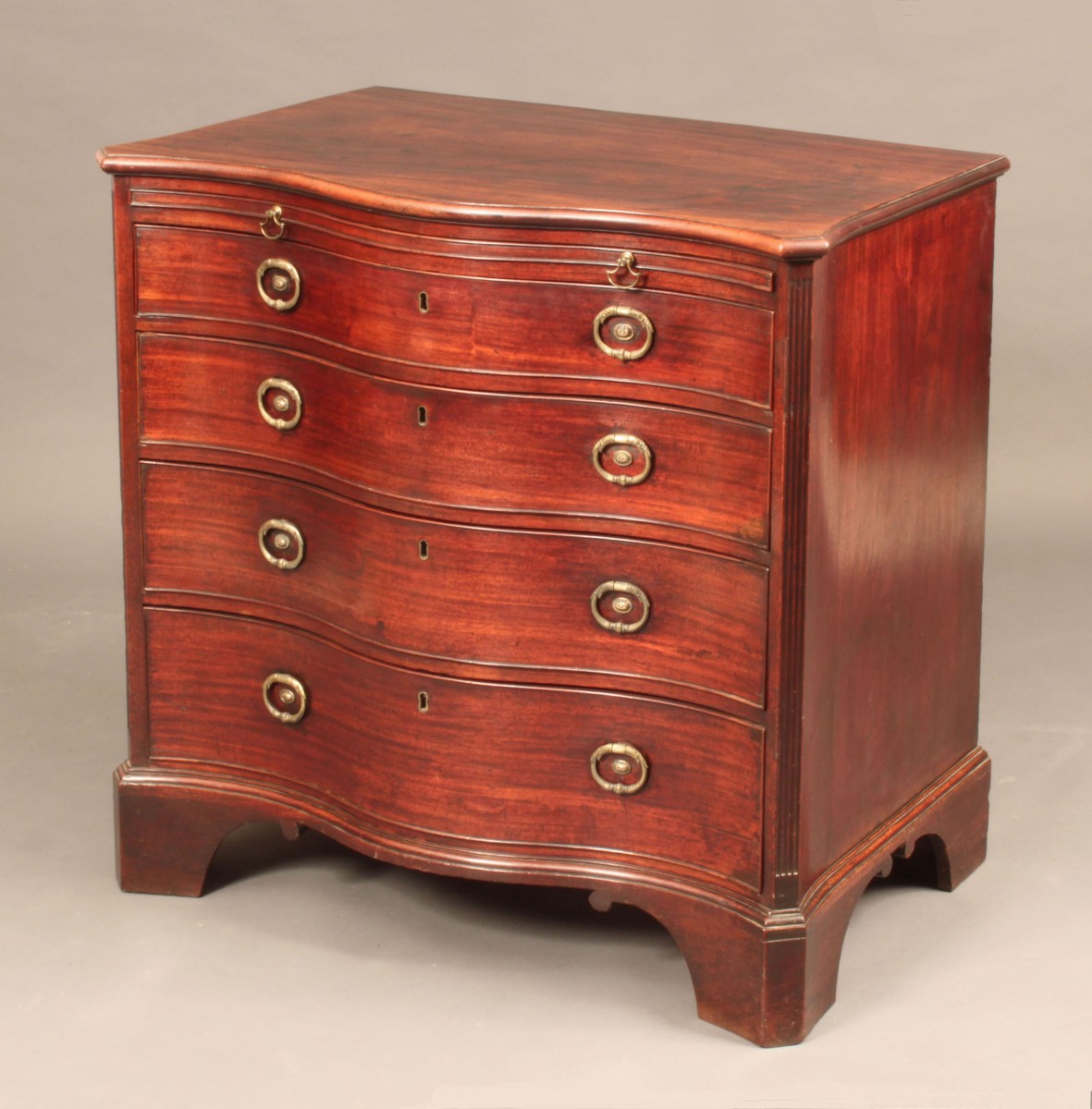 A rare George III mahogany serpentine chest only 35.5” wide; reeded, canted corners, shaped sides. original bracket feet, oak lined drawers and of a good rich colour; the handles have been replaced in the correct style.