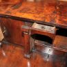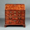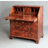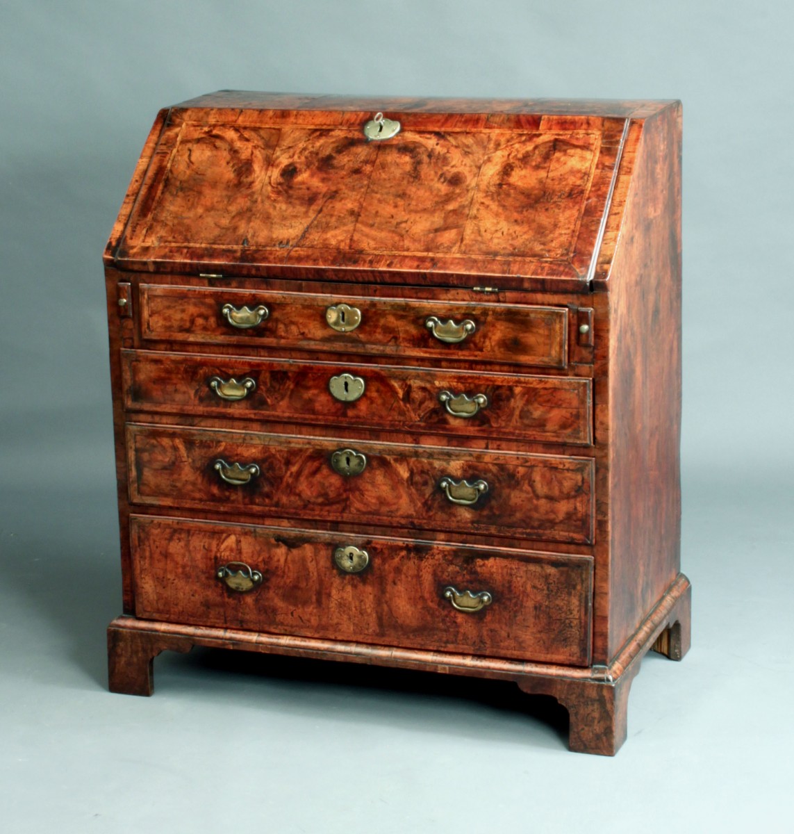 An early eighteenth century small veneered walnut bureau of a particularly lovely original colour and patina; original brass handles and bracket feet; the top, the fall and all the drawers, including the interior drawers, with herringbone banding; the base moulding and all the mouldings around the drawers and the fall in cross-grained walnut.