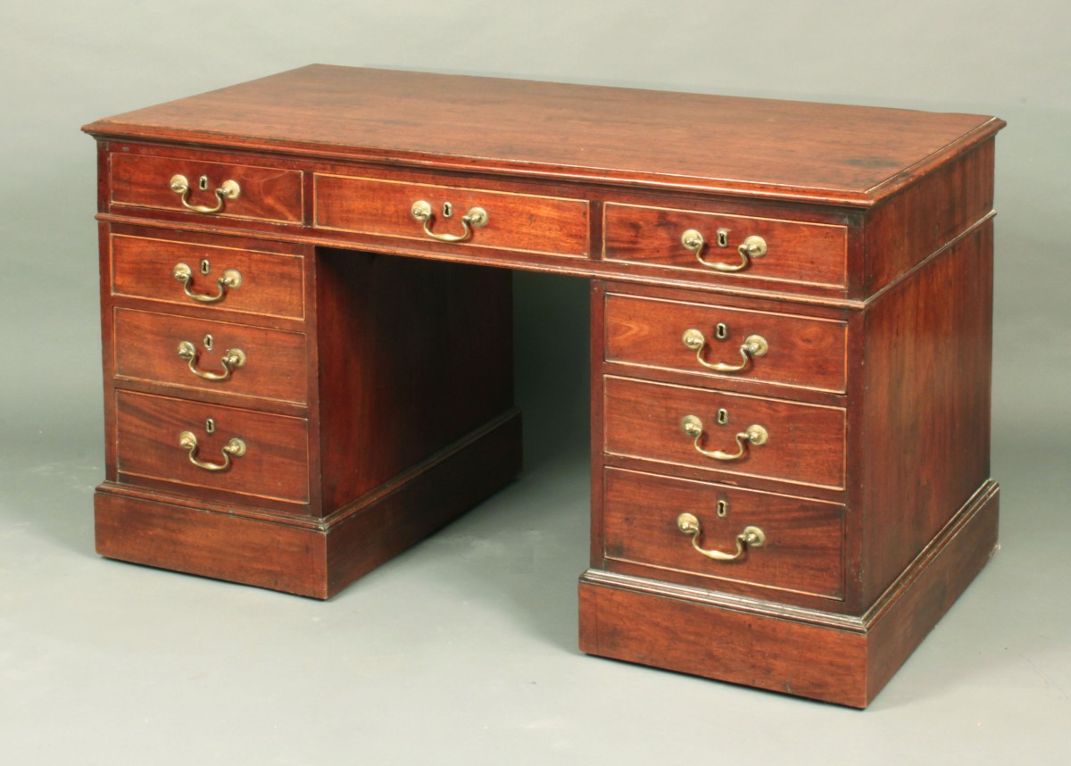 George III Chippendale period three-part mahogany pedestal desk with the original wooden top surface, cockbeaded drawers and original handles; good colour and patina