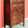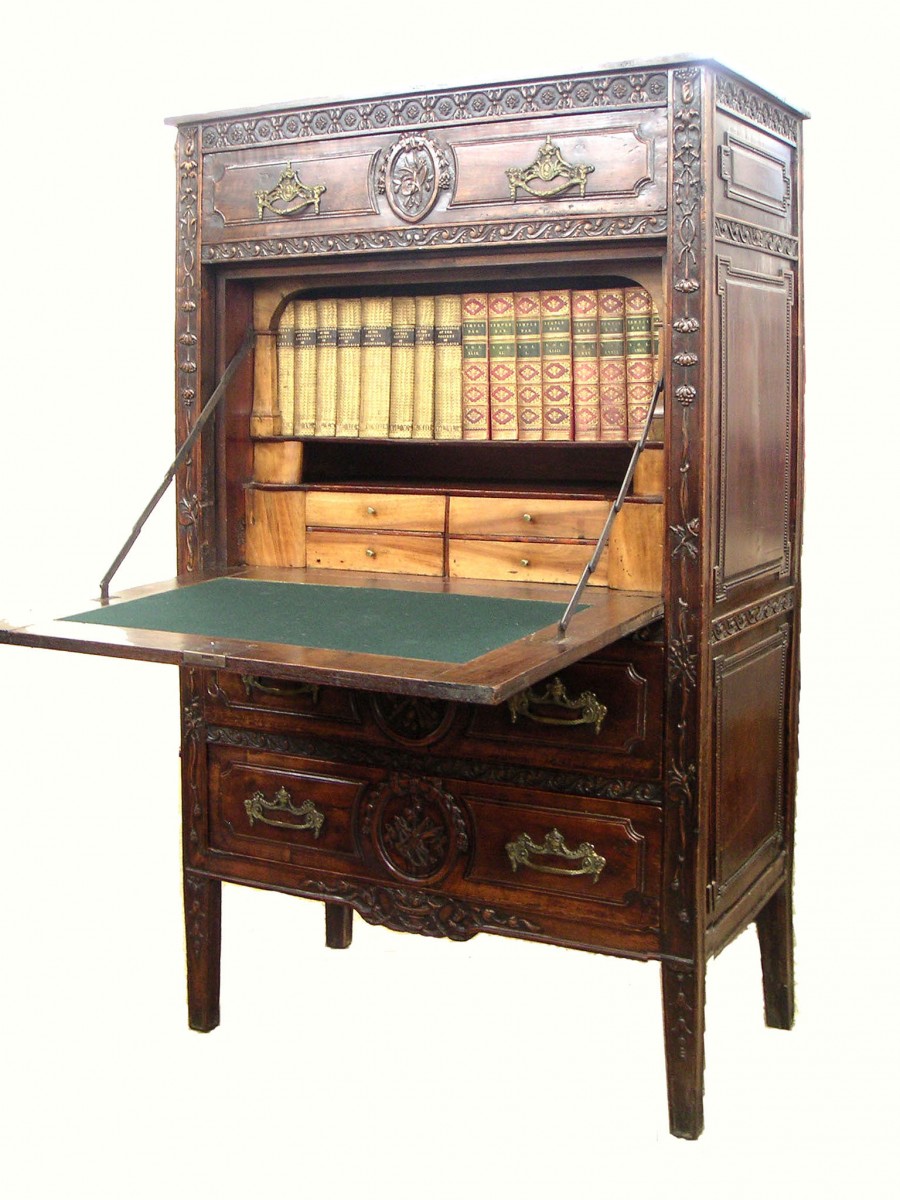Louis XVI escritoire in walnut with particularly fine carving, also called a secretaire abattant; with drawers and a space for books behind the fall front.