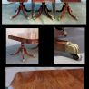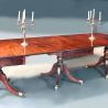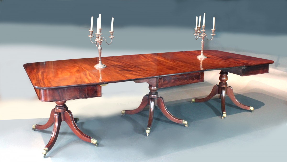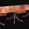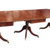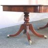 An attractive Regency dining table in figured mahogany, the veneered frieze above three elegant 4 splay bases: handsome turned pillars and sabre legs with carved moulded tops and the original brass sabot castors of a similar moulded design. Folding hinged centre section. The table largely in original conditon including its old colour and patina. One hinged leaf has an old repair and is now made from 2 pieces of mahogany. Comfortable 24" knee height.