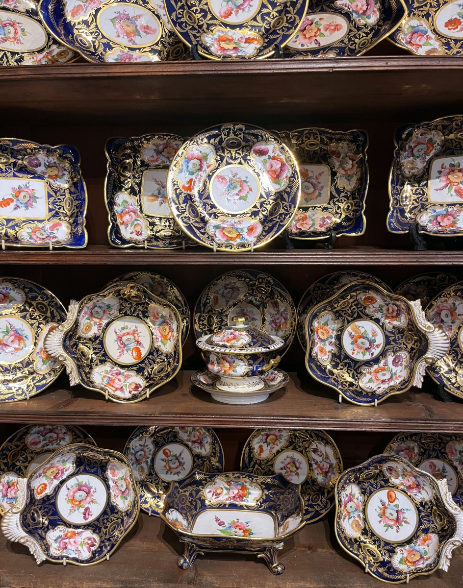 A fine Regency John Rose, Coalport porcelain dessert service. Decorated with shaped reserves of hand painted flowers against a cobalt blue ground with good quality gilt decoration.