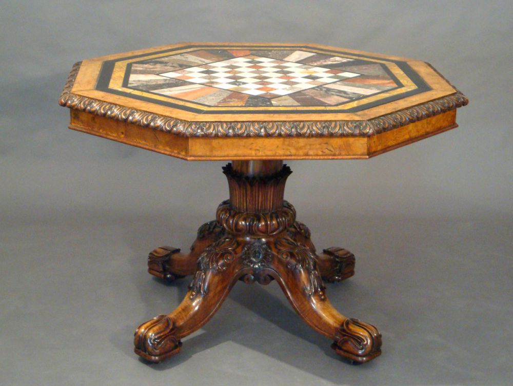 An exceptional Regency walnut centre table with a specimen marble top on a bold well-carved four-splay base; perhaps by Gillows of Lancaster